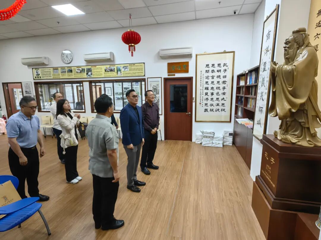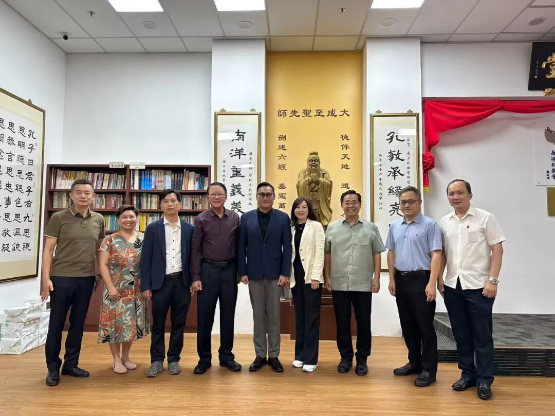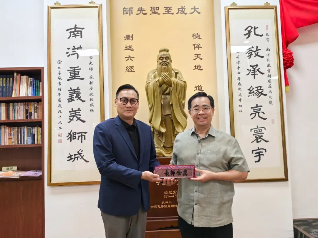 2025年10月17日至19日,孔子七十九代嫡长孙、至圣孔子基金会会长孔垂长先生一行来到新加坡,受邀参加南洋孔教会111周年会庆活动,并在主题为“AI时代的儒学与社会”的国际儒学研讨会上致辞。10月17日下午,孔垂长先生一行到达新加坡南洋孔教会会所。孔垂长会长伉俪在南洋孔教会王国华会长等陪同下参观了南洋孔教会会所,祭拜孔子圣像。在随后座谈中,至圣孔子基金会执行长陈泰旭介绍了基金会基本情况,重点介绍了这些年在海峡两岸和国际推广儒家文化的实践活动,特别是孔子文化春会及相关活动。孔垂长先生热情邀请新加坡南洋孔教会、新加坡儒商学会等各家团体和同道共同参与基金会举办的上述活动,得到与会各方积极响应。孔垂长先生赠送南洋孔教会会长王国华“万世师表”水晶镇尺